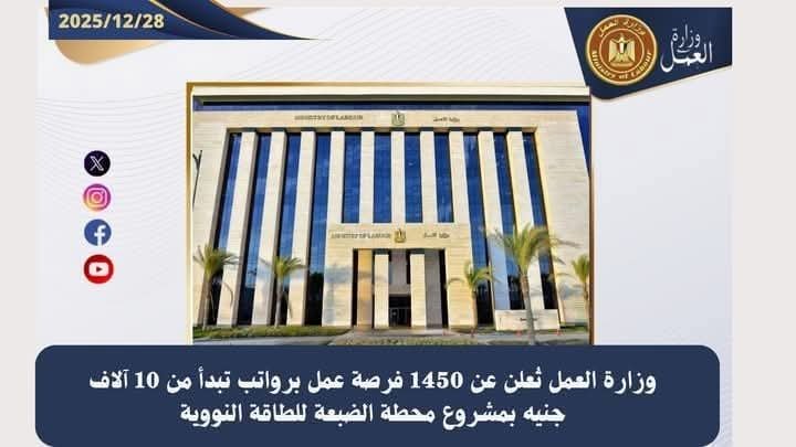 وزارة العمل تُعلن عن 1450 فرصة عمل برواتب تبدأ من 10 آلاف جنيه بمشروع محطة الضبعة للطاقة النووية
